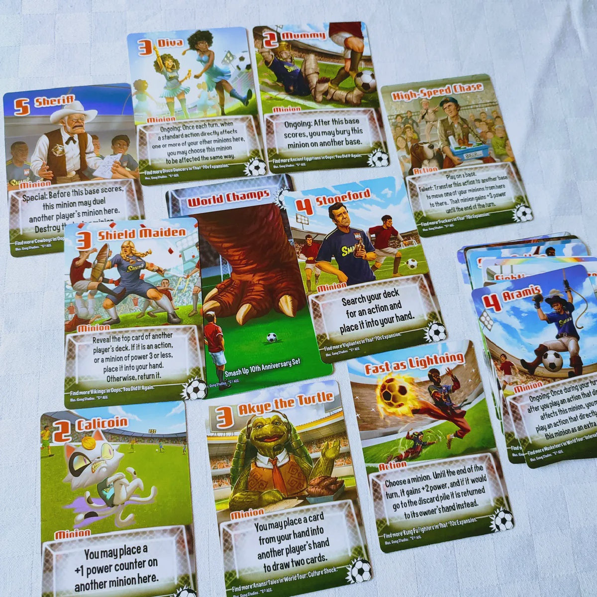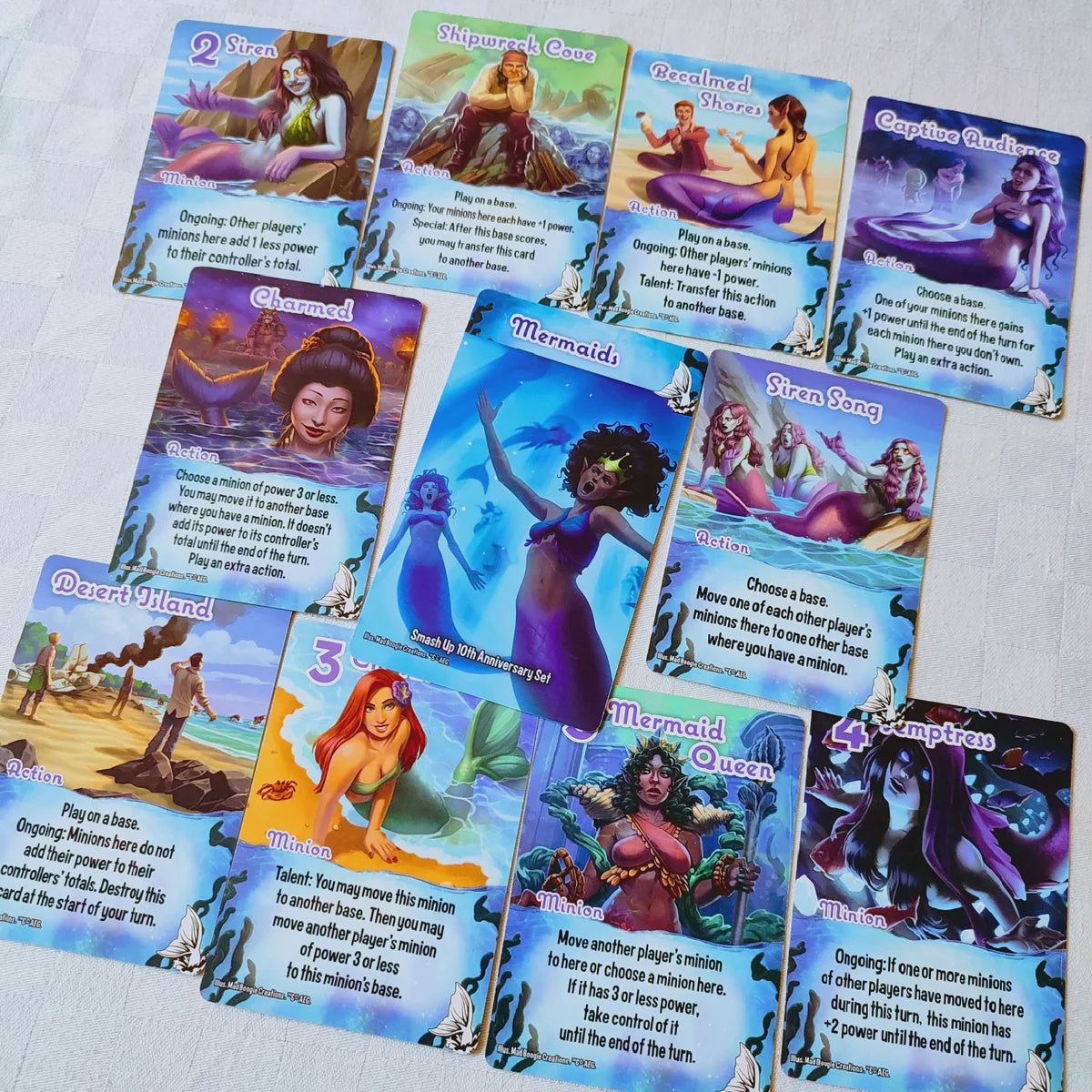 The Smash Up 10th Anniversary Set includes the new factions: Mermaids, Skeletons, and the World Champs, as well as brand-new Titans, and a reprint of the Sheep faction for those who may have missed out the first time. It also includes several great components for upgrading your game of Smash Up, such as base mats and a new Goblin token, and the all-new Big Base, an entirely new way of playing Smash Up!