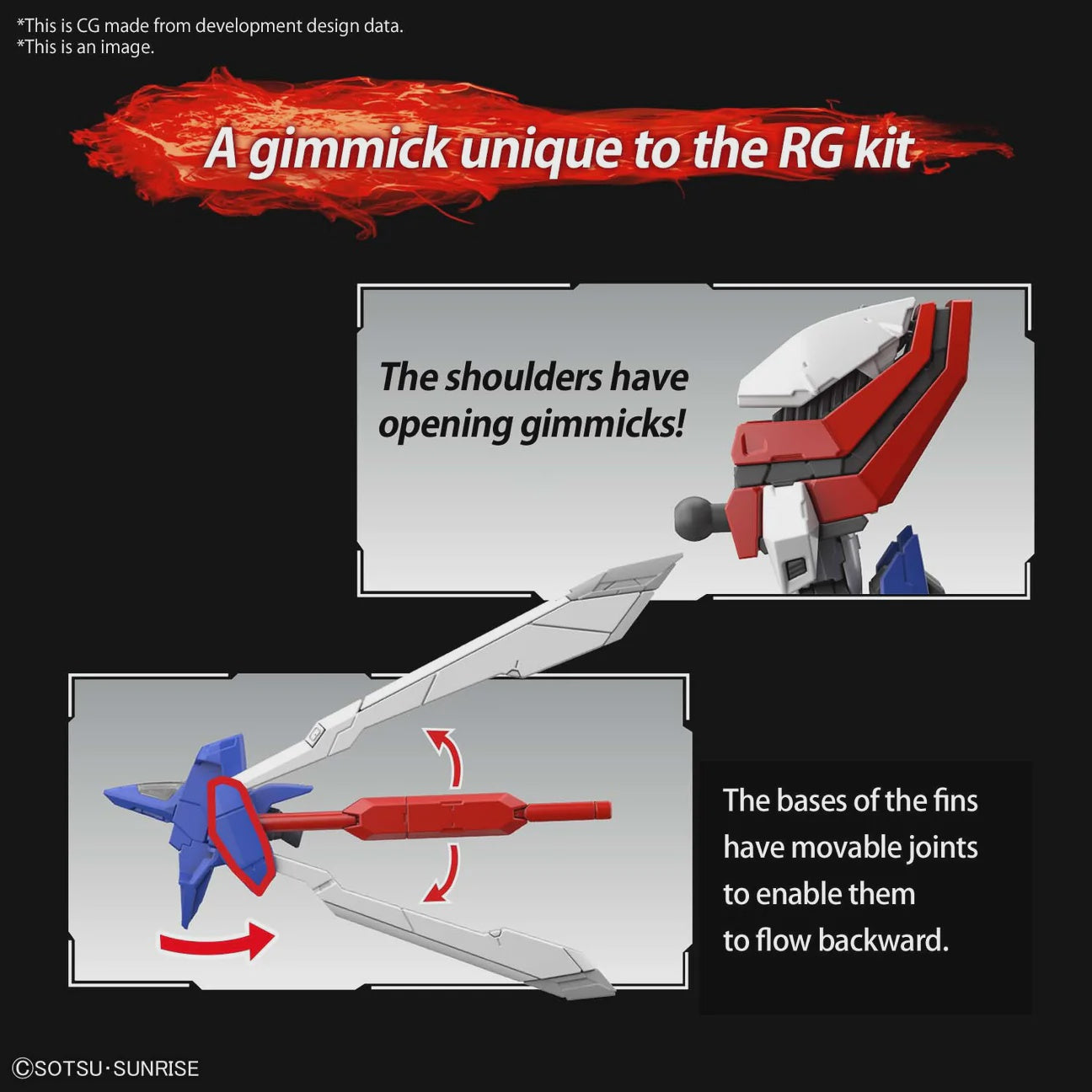 The advanced MS joints on its shoulders and wrists allow you to recreate its characteristic folded-arms pose, and a telescoping gimmick in the shoulder improves side-to-side motion of the arms. A three-axis structure in the neck means God Gundam can pull in its chin and stick out its head! The rear of the knees shows a dent to accommodate realistic motion, and a new mechanism is used to move the toes, allowing the feet to touch the ground while the legs are open nearly horizontally!