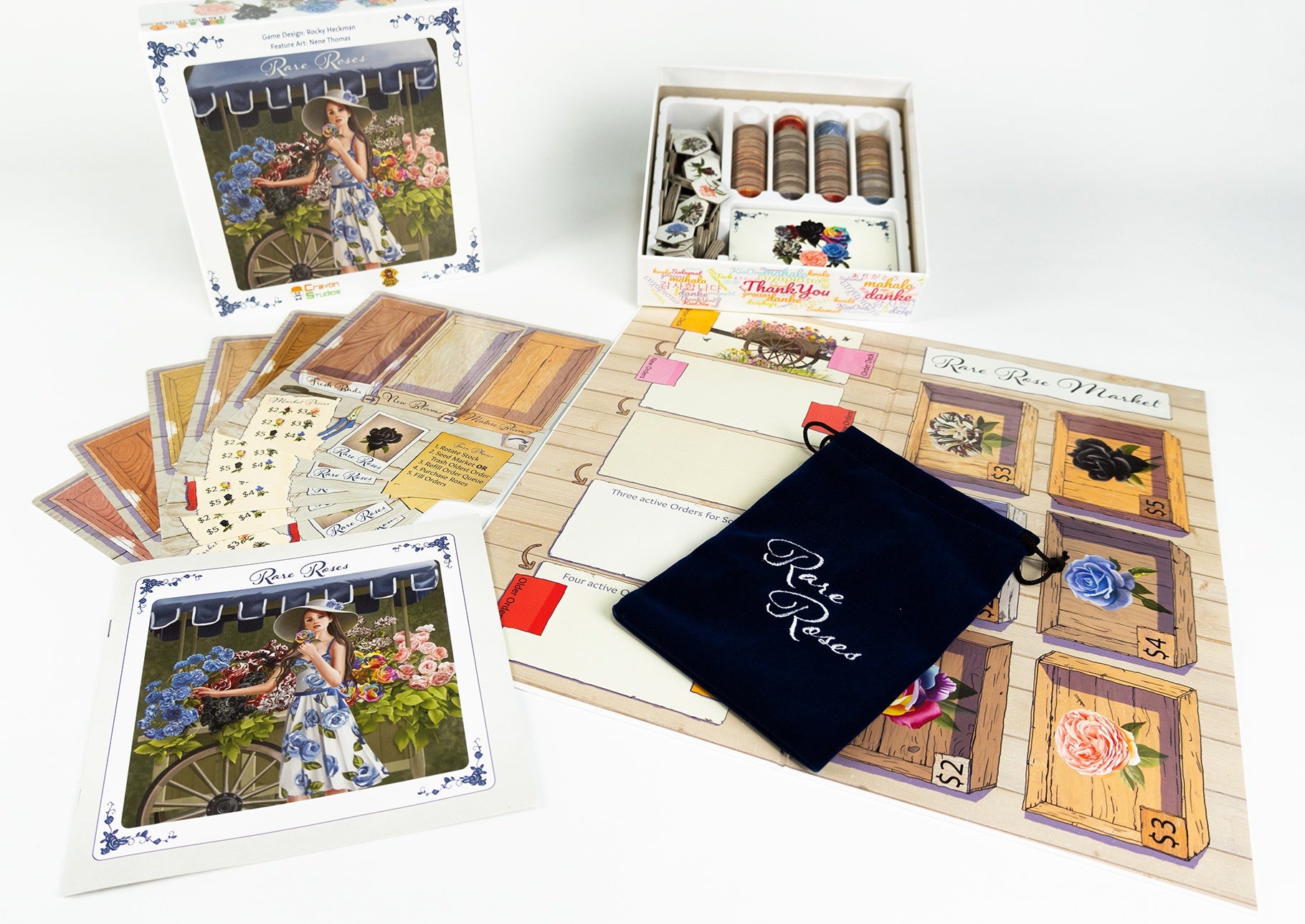 You will compete against other floral designers to be the best floral designer in town. You will purchase rose buds from the market for your stock. You must manage your stock from buds, to blooms, and eventually you will lose that stock if you don’t use it to fill orders. Each player will have a Rose