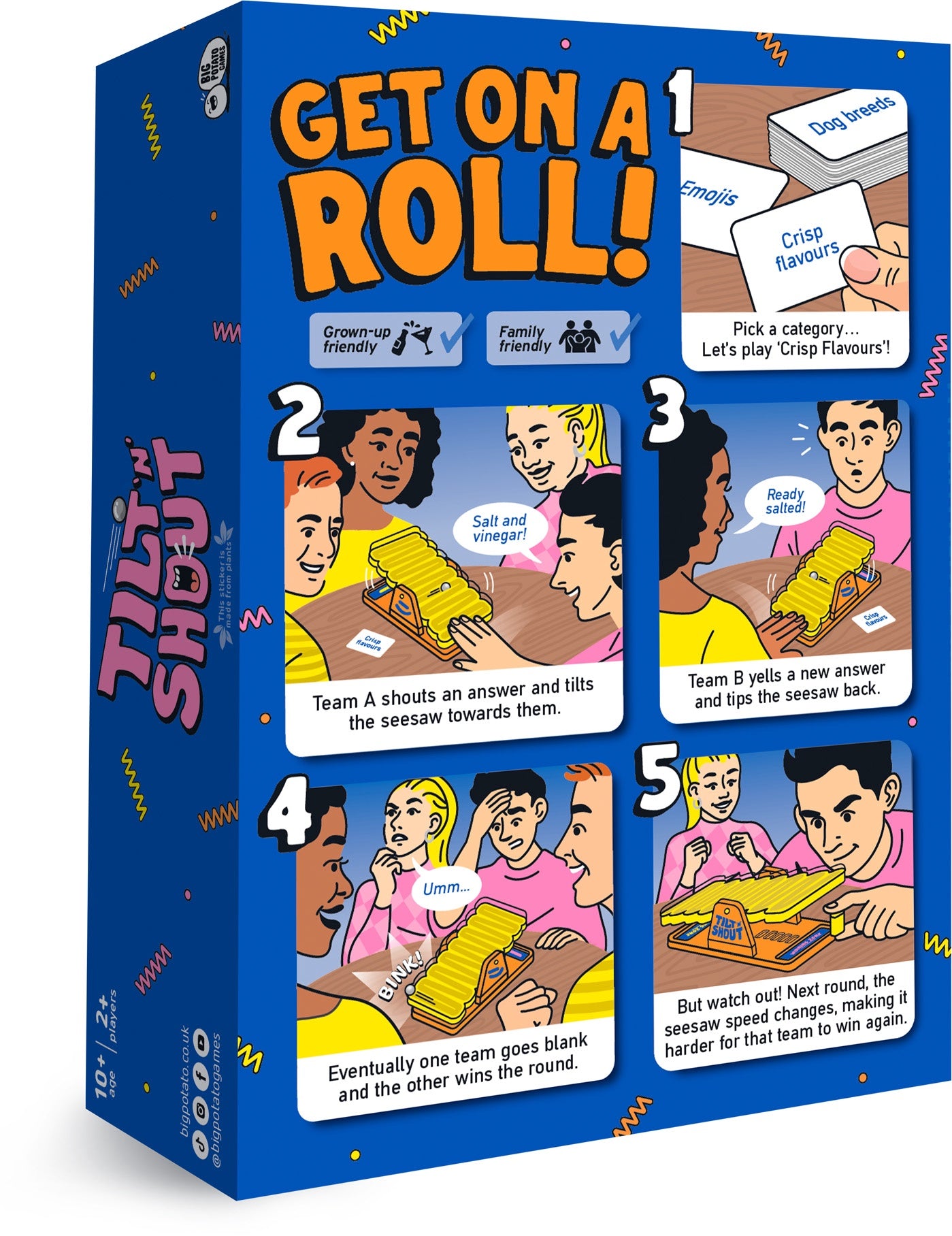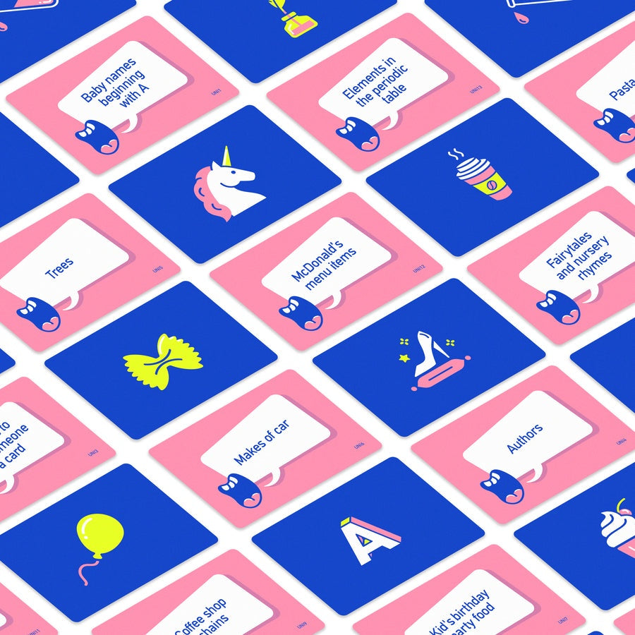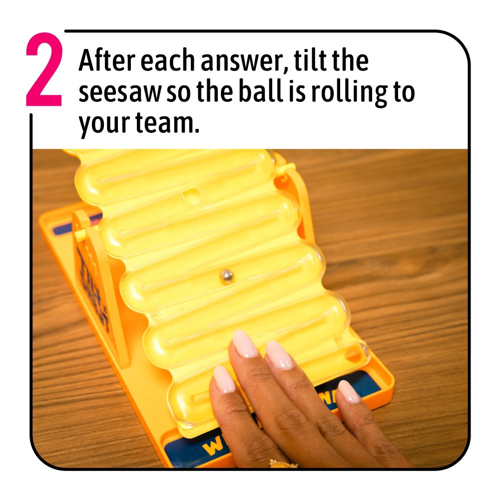 A back and forth, shouty-outy party game for two teams. Both teams have to shout out answers to the same category in turn. If a team goes blank, and can't think of an answer in time, the other team captures the ball and wins the round. But watch out, this game comes with underdog comeback technology, so the better you do, the harder it is to win.