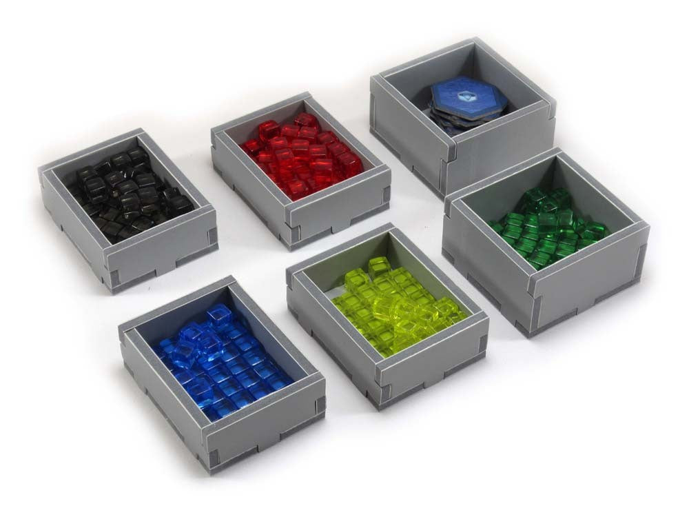 This insert is designed to be compatible with Terraforming Mars®, and includes space for the Hellas & Elysium®, Venus Next® and Prelude® expansions. The design provides both efficient storage and improved game play. Many of the trays can be utilised during the game, and they greatly aid set-up and clear-away times. The boards and player boards act as a lid on top of the trays.