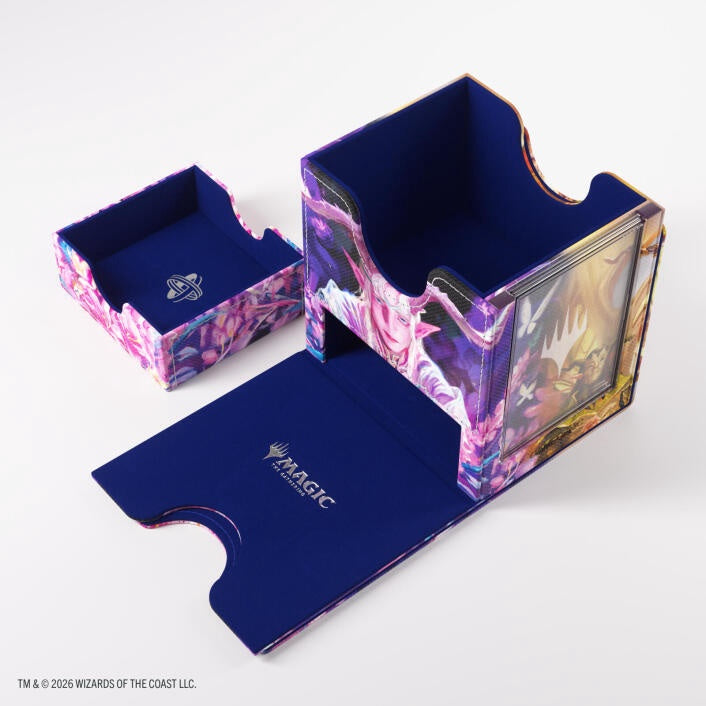 The Slide Card Case is seamlessly integrated into the front of the box and can be removed for use during gameplay, allowing players to display their Commander card while keeping it fully protected at all times. A hidden, sturdy drawer provides extra storage for tokens or dice, ensuring all gaming essentials stay organized. The box fits 100 double-sleeved cards, even in extra Thick Inner Sleeves, or 100 regular double-sleeved cards with added room for token cards or Sideboard. Equipped with Gamegenic’s signature convertible system, the removable cover attaches to the bottom of the box, saving table space and providing effortless access to cards during play.
