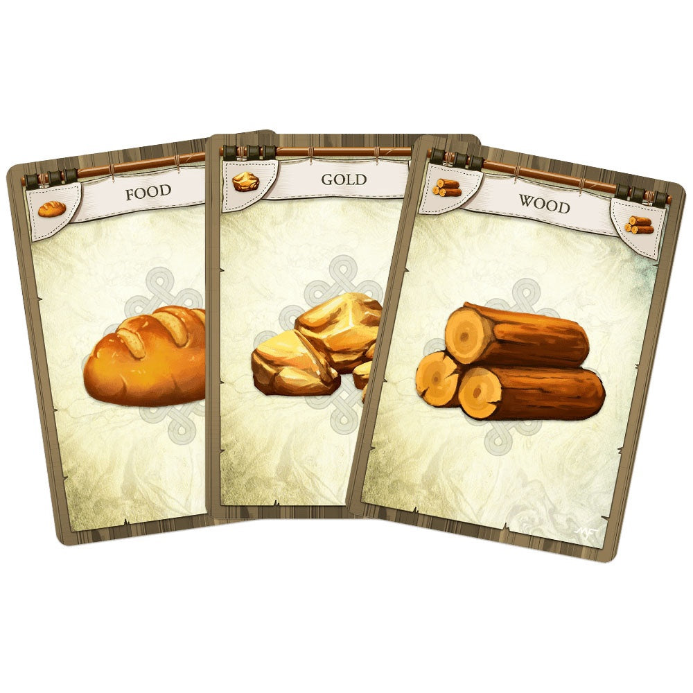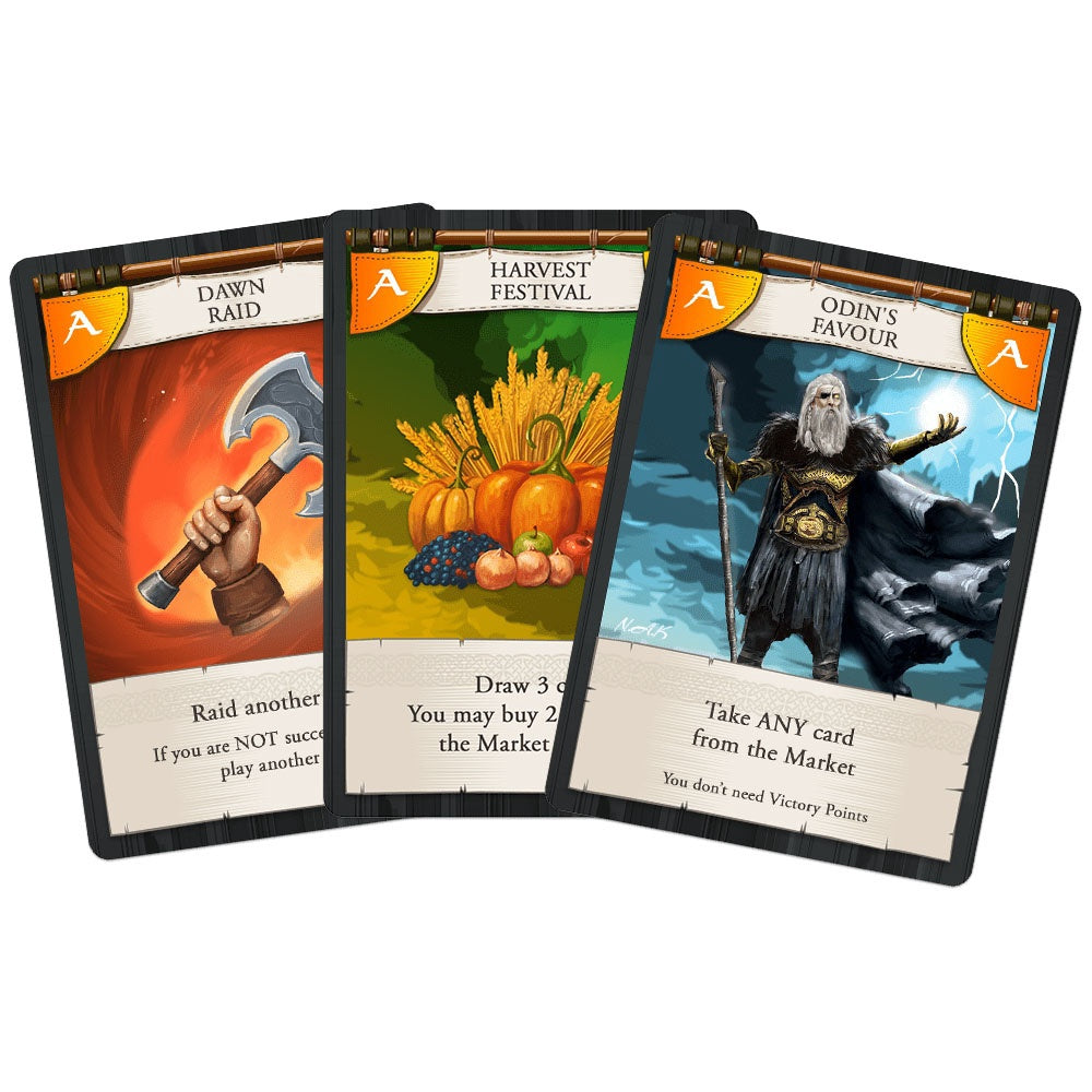 On your turn, you draw 2 cards to see what your clan has been up to whilst you have been away 'chiefing'. Have they focused on resources and mined stone or gold, collected wood, created new Vikings, or built up the food supplies? Sometimes they have spent their time preparing actions for you by capturing a wandering Berserker or preparing for a raid (one of their favourite endeavours). Or maybe they have gained a favour from one of the Norse gods or goddesses?