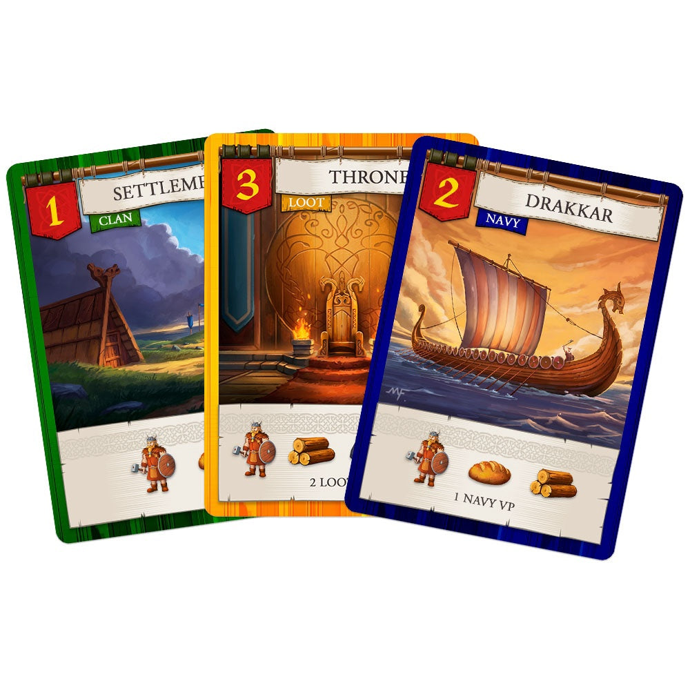 For each turn, you may take one action (for example, go on a raid or use a favour from a God or Goddess) and buy one item from a central market. You buy items using resources in your hand, and you can choose between ships for your Navy, buildings for your Clan and valuables for your Loot. Each item gives 1-3 Victory Points, and the first player to have an agreed number of Victory Points in each category wins the game.